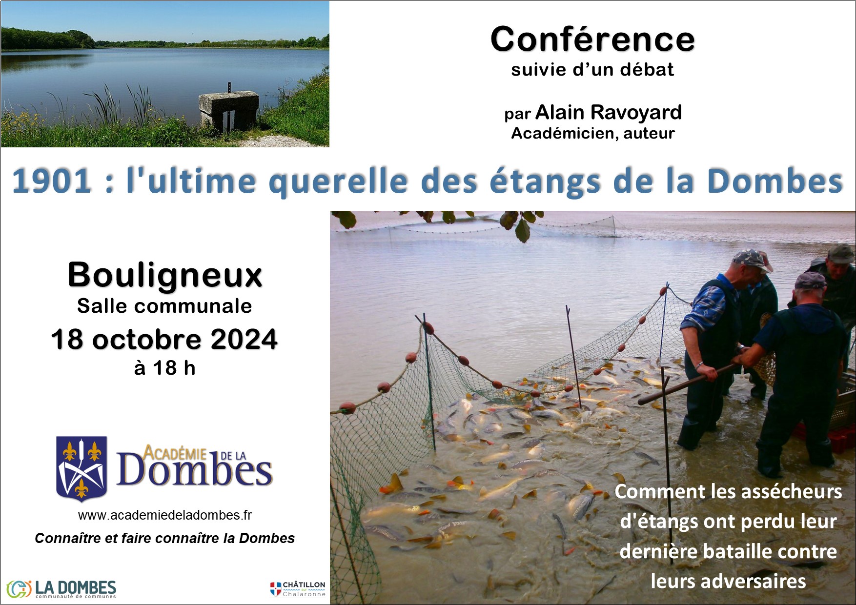 Alain Ravoyard a présenté la conférence "1901 : l’ultime querelle des étangs de la Dombes" vendredi 18 octobre 2024 à 18 h dans la salle communale de Bouligneux.